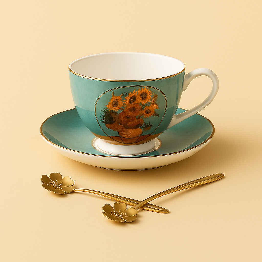 A chávena Van Gogh é um convite a transformar o quotidiano em arte. Produzida em porcelana fina com mais de 36% de farinha de osso, une leveza, resistência e sofisticação. Cada peça homenageia o génio de Van Gogh através de padrões icónicos como Noite Estrelada, Girassóis e Íris, que transformam o simples ato de beber café num ritual cultural e estético.