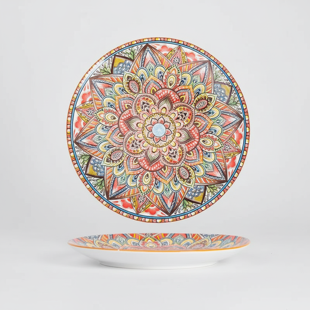 O Prato Raso Bohemian destaca-se pelo seu design mandala vibrante, que une o espírito boémio à sofisticação da cerâmica artesanal. Ideal para entradas, pratos principais ou para decorar a mesa com um toque artístico.
