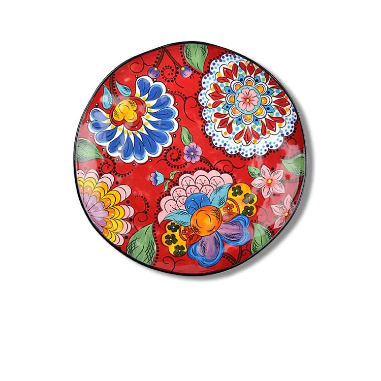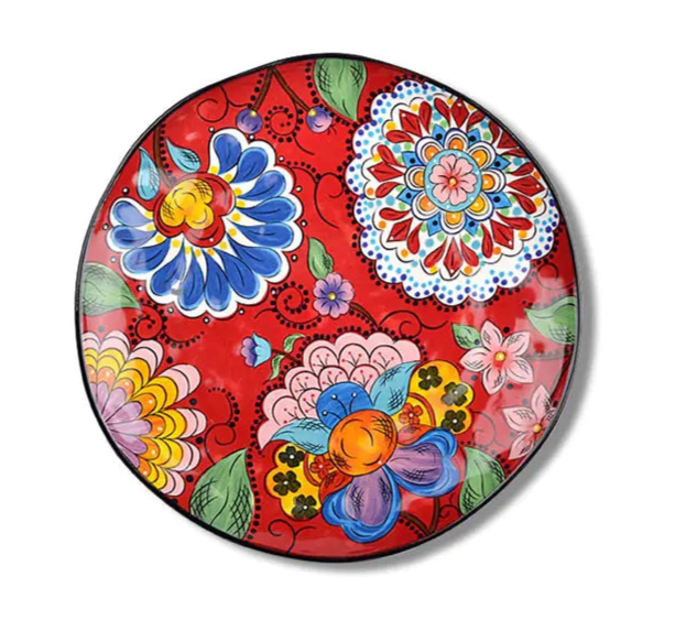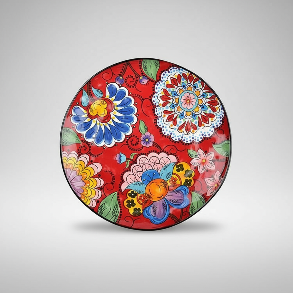 O Prato Decorativo Kara Murale combina cores intensas e desenho floral expressivo, criando uma peça decorativa de forte impacto visual.