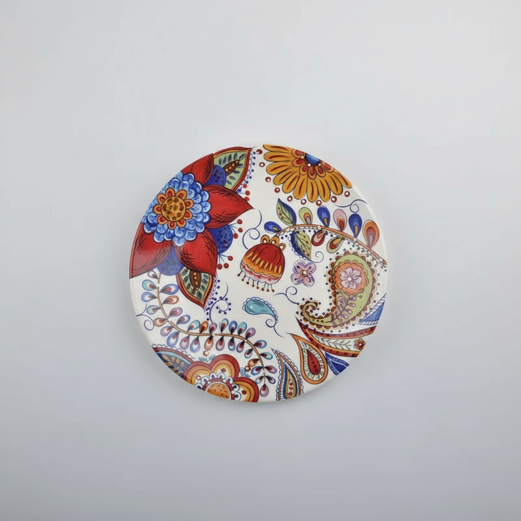 O Prato Decorativo Karina Murale exibe padrões delicados e cores vibrantes que celebram a natureza e a arte mural tradicional.