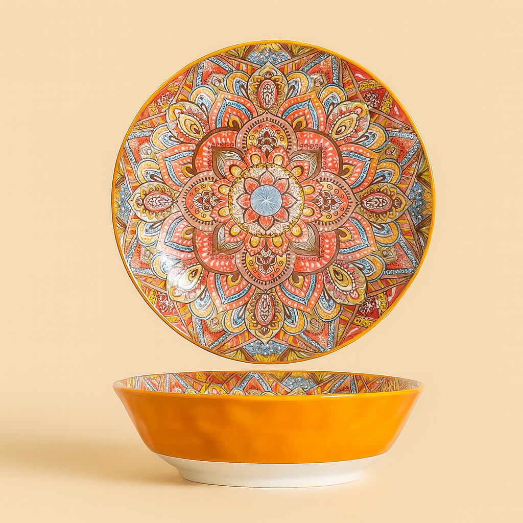 Com 20,5 cm de diâmetro e borda alta em laranja intenso, o Prato Fundo Bohemian é perfeito para sopas, massas ou saladas. A sua estética mandala traz cor e energia a qualquer refeição.
