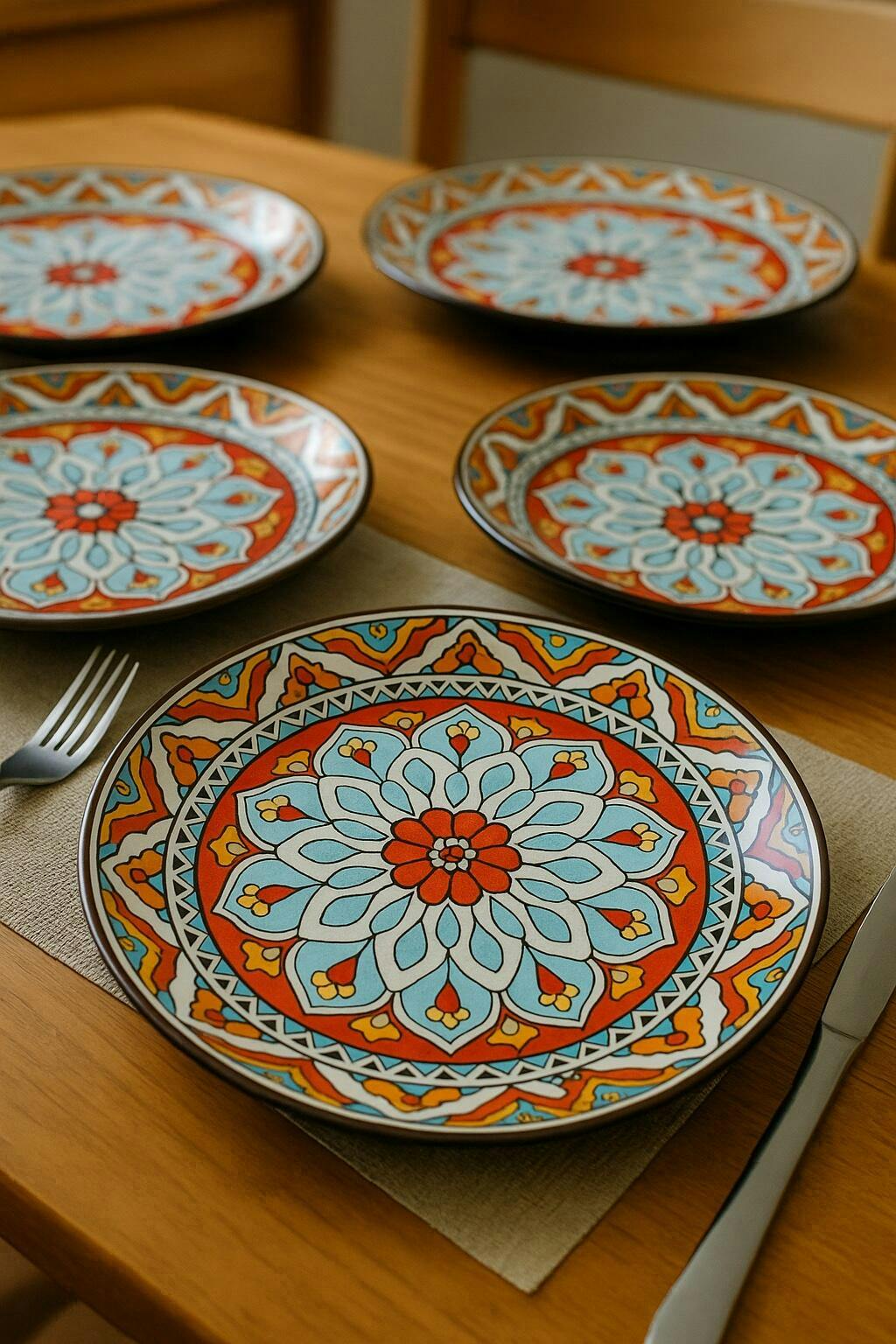 O prato Mandala é uma celebração da arte decorativa em cerâmica. Pintado à mão em porcelana premium, cada peça apresenta padrões florais e geométricos que evocam o calor das tradições mediterrânicas e marroquinas, transformando a mesa num palco de cultura e elegância.