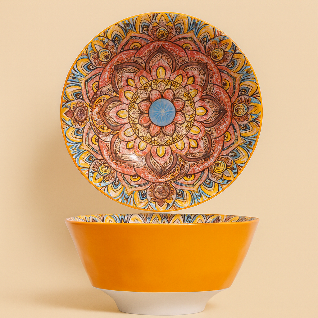 A Taça Bohemian combina formato prático com design artístico. Com 12,5 cm de diâmetro, é ideal para cereais, sobremesas ou acompanhamentos. O padrão mandala dá vida e originalidade a cada peça.