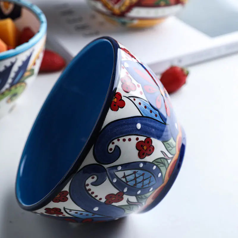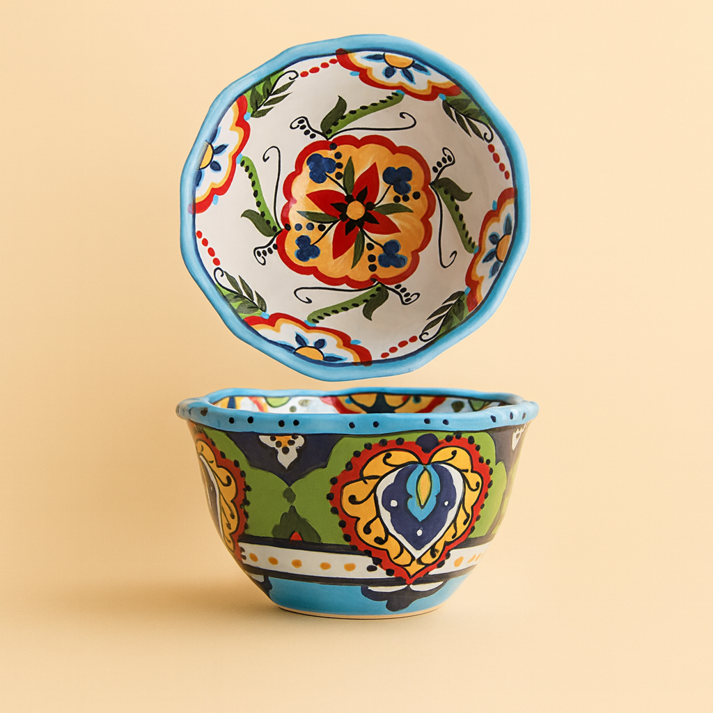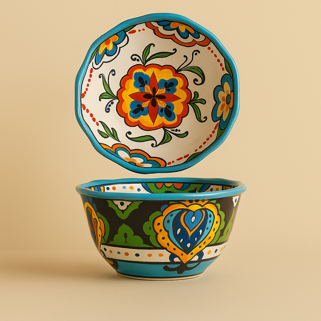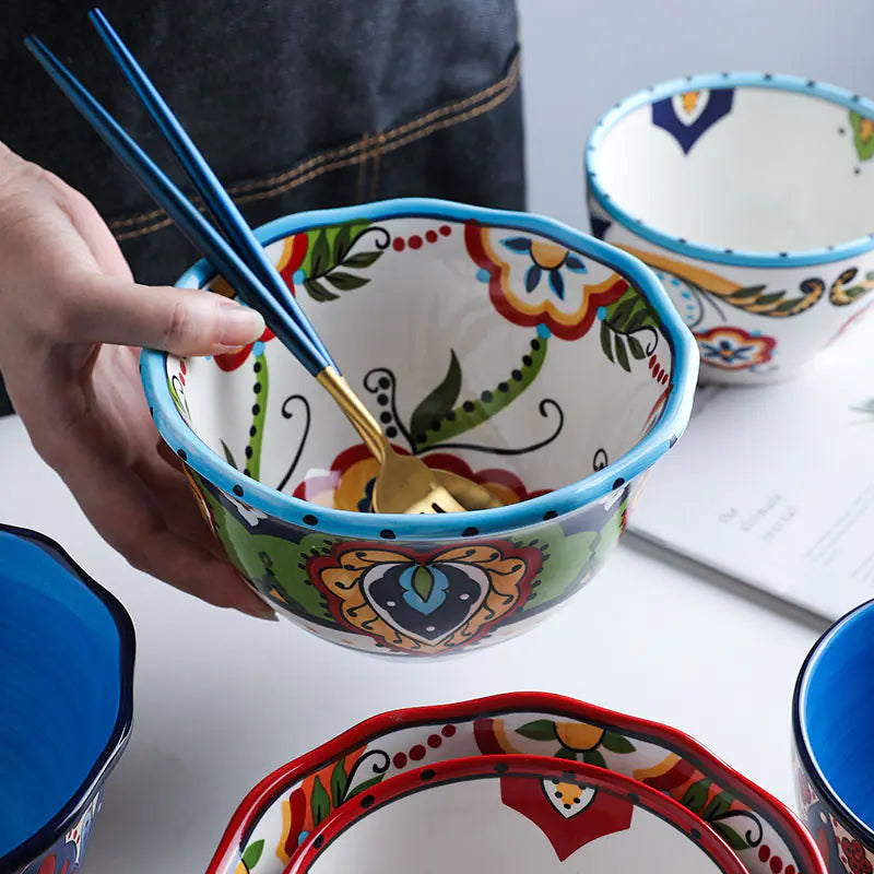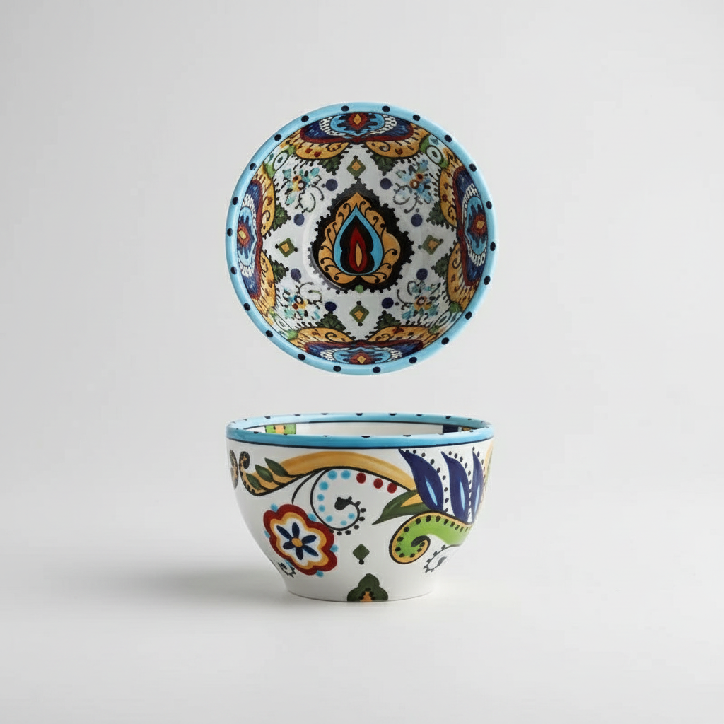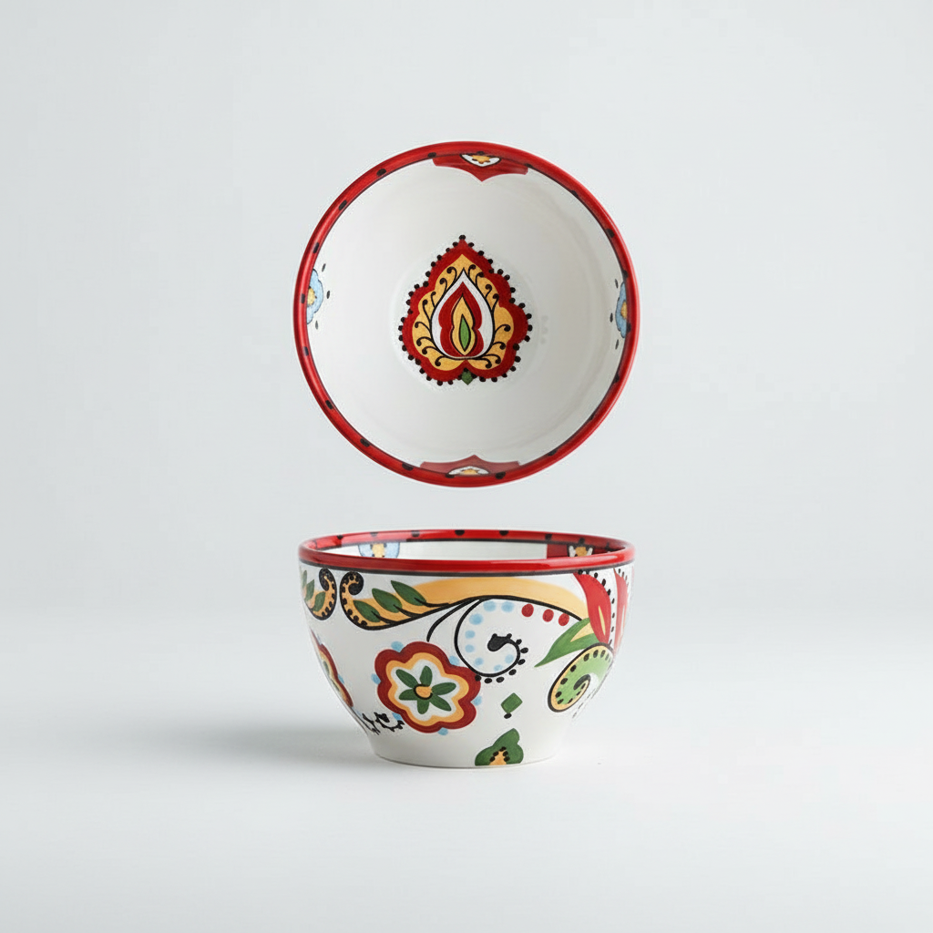 A coleção Éclat traz para a mesa a fusão entre a leveza do estilo boêmio e a sofisticação do detalhe dourado. Cada tigela é pintada à mão em porcelana de alta qualidade, revelando cores vibrantes que transformam qualquer refeição num momento de expressão artística.