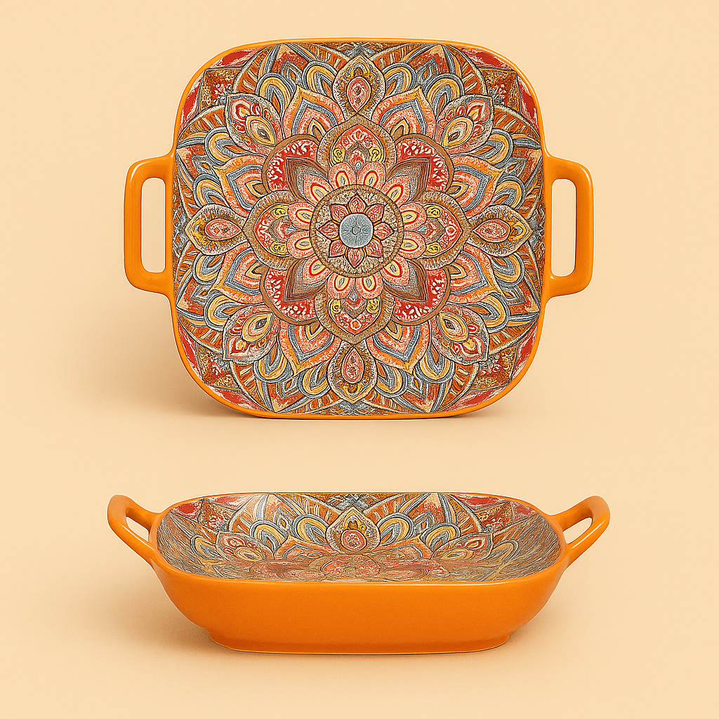 A Travessa Bohemian com Pegas é funcional e decorativa. Com 22,5 cm, é perfeita para assados, massas ou partilhar petiscos. O padrão mandala e as asas laterais tornam-na prática e única.